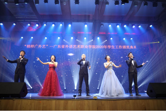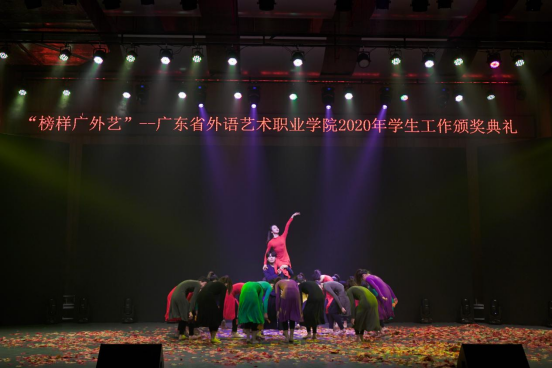 颁奖典礼以歌舞、朗诵、音乐剧等形式,向观众展示了广外艺榜样的风采。广东省高校“双带头人”教师党支部书记工作室负责人谭伟民等4名老师带来的朗诵《载着使命前行》,诠释了人民教师牢记树人使命,用知识与汗水,助力学生扬帆启航的坚守和初心。音乐舞蹈学院鲁源、陈雨朦老师带来的音乐剧《因乐聚》,深情演绎了逐梦拼搏、践行责任担当的故事。艺术教育学院程争等4名老师和学生带来的歌舞表演《花开新时代》,洋溢着对祖国繁荣昌盛的由衷赞美,寄语外艺人将青春之花绚烂绽放在祖国新时代。音乐舞蹈学院文婷老师和学生带来的歌舞表演《红旗颂》,表达了仰望红旗、蕴含深意的致敬和对伟大祖国的热爱之情。艺术教育学院和广东第二师范学院协同培养的连怡柔等5名同学带来的男女声重唱《光之心》,展现了砥砺奋进不惧风雨,追光逐梦提升自我的态度。音乐舞蹈学院的群舞《脊梁》、《水姑娘》、艺术教育学院的群舞《青春启航》,将精湛的专业素质和精彩艺术表演完美融合,为现场观众奉献了一场精彩纷呈的视觉盛宴。