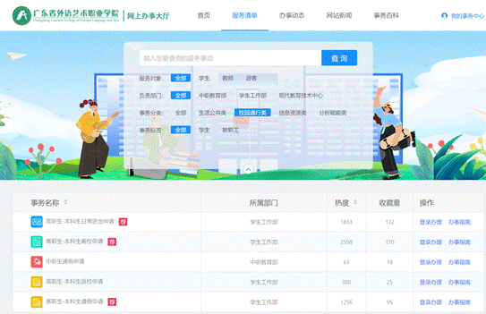 为适应后疫情时代常态化防控的要求,学校在移动学工系统开通网上办事大厅,启动校园通行类服务流程,服务数据与学校疫情防控系统、校门刷卡机同步共享,学生只需在手机上进行报备审批,即可快速、便捷地出入校门,辅导员也可在系统及时查看学生去向,审核返校健康信息。
