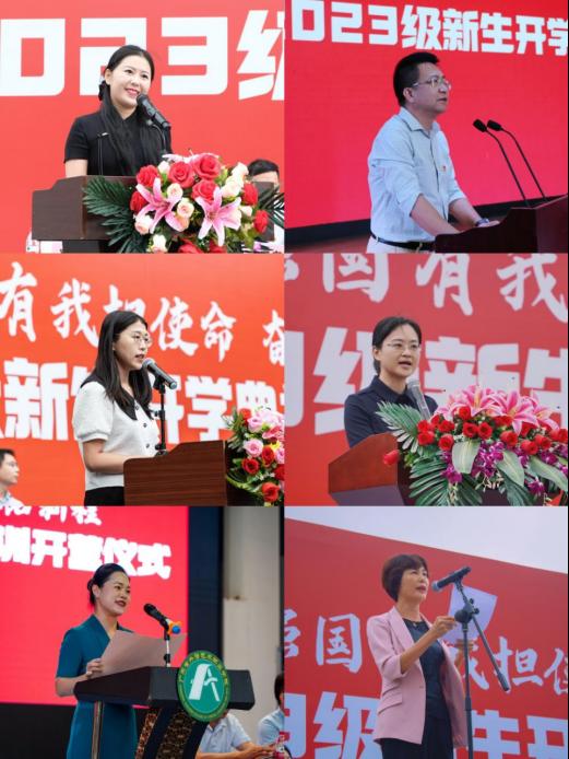 各校区的教师代表向2023级新同学表示热烈欢迎,并送上衷心的寄语。艺术教育学院邓玥老师、基础教育学院谭伟民老师、公共管理与服务学院王艺青老师、外语外贸学院蓝媚老师、财会金融学院张瑜老师、餐饮旅游学院许映花老师纷纷表达了对新同学的希冀,希望同学们励学笃行、勤奋创新,争做堪当大任的时代新人。