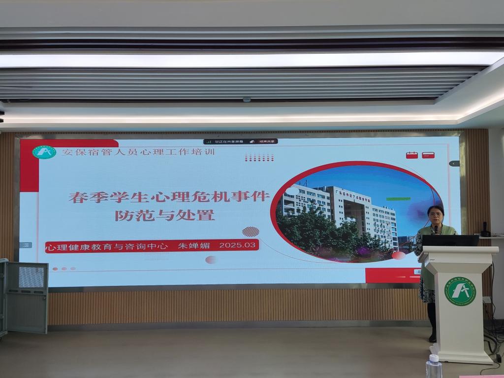 朱婵媚结合大学生常见心理问题和校园危机预防和干预案例,明确保安、宿管、食堂员工在学生心理健康教育工作中的角色和职责,指导其在日常工作中通过“八必看”,及时识别需要关注帮扶的人员,通过有效识别、倾听、提问等技巧温暖学生,在遇到危机时,通过“五步走”争取救援时间。