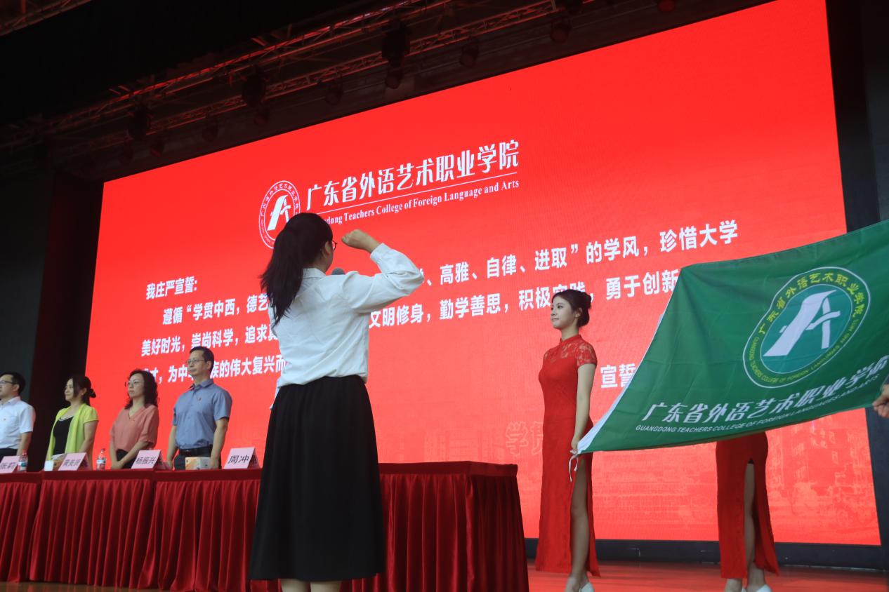 新生入学宣誓环节成为凝聚信念的高光时刻,礼仪队庄重展示校旗,新生代表引领全体同学高举右拳,从家国担当到专业追求的铿锵誓言响彻会场,既彰显新广外艺人的精神风貌,更将个人理想与集体信念紧密相连。