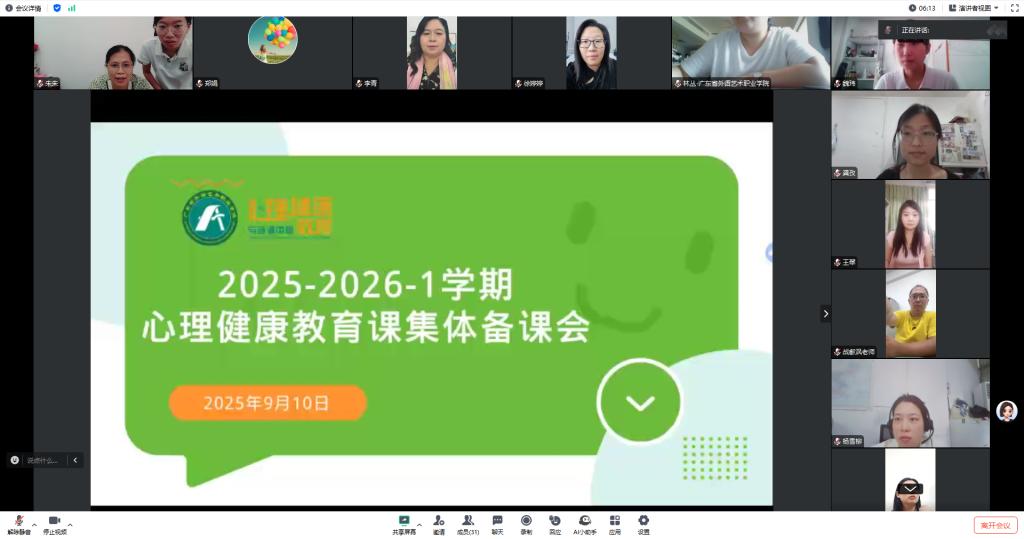 2025年9月10日下午,我校心理健康教育与咨询中心通过腾讯会议组织召开2025-2026学年第一学期心理健康教育课集体备课分享会。本次会议旨在进一步提升心理健康教育课程教学质量,促进教师之间的经验交流与资源共享,为新学期心理健康教育课程的开展奠定坚实基础。全体科任教师和两名校级督导都参加了此次会议。