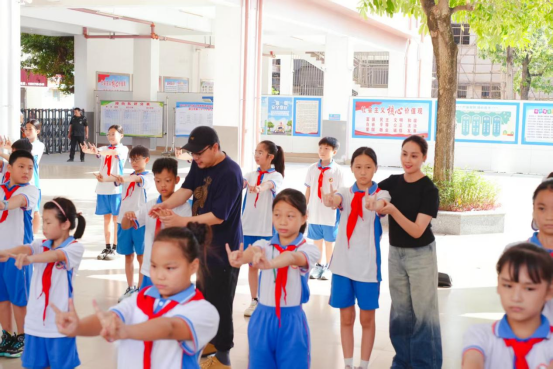 在教师培训方面,面向霞山区50名中小学艺术教师,开展了为期三天的系统培训。培训内容不仅包括傩舞历史文化背景的解读、基本动作的规范化教学,更着重于非遗课程设计与教学方法创新。通过理论讲授、示范教学、实践指导等环节,全面提升参训教师的非遗传承教学能力。在“校园推广”环节,团队深入霞山区三所小学,面向三百多名学生开展了生动有趣的傩舞体验课程,通过寓教于乐的方式激发孩子们对传统文化的兴趣。随着鼓点有模有样地模仿着傩舞动作,欢声笑语中传递着文化传承的喜悦。
