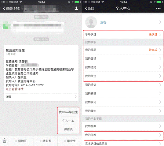 招聘信息:可查看全职岗位、实习岗位、校内校外宣讲会、省内双选会、在线招聘;