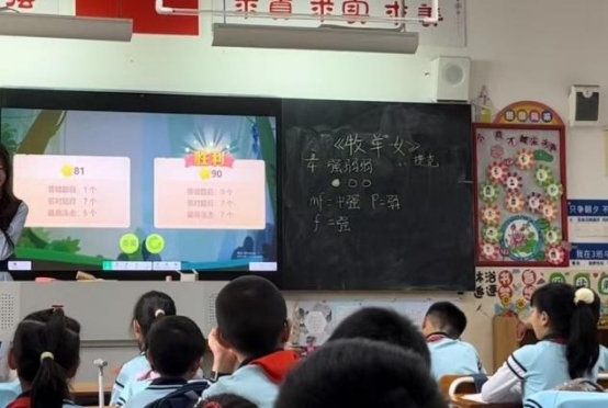 让学生积极主动地参与到音乐课中需要教师丰富课堂形式、例如:声势律动、使用奥尔夫乐器、希沃教学平台游戏等。