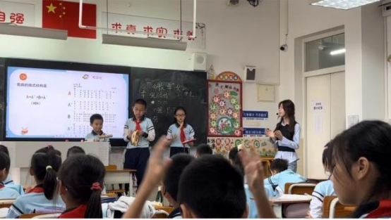 紧接着,广州市罗珺民师工作室的许建纯老师为我们带来了粤语童谣弹唱《椰子夹酸姜》的课例。尽管班级里有一半的同学不会讲粤语,但许老师运用她的独特方法,通过动画帮助学生记住了歌词。最终,学生们不仅能够用四弦琴弹奏,还能演唱这首歌曲。许老师注重学科融合,她鼓励学生发挥自己的特长,将音乐与舞蹈、书法等艺术形式相结合,展示了学生的多样性和音乐的丰富性。