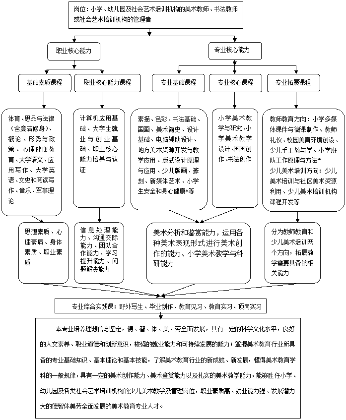 本专业培养理想信念坚定,德、智、体、美、劳全面发展,具有一定的科学文化水平,良好的人文素养、职业道德和创新意识,较强的就业能力和可持续发展的能力;掌握美术教育行业所具备的专业基础知识、基本理论和基本技能,了解美术教育行业的新成就、新发展,懂得美术教育学科的一般规律,具有一定的美术创作能力、美术鉴赏能力以及扎实的美术教学能力,能够胜任小学、幼儿园及各类社会艺术培训机构的少儿美术教学及管理岗位,职业素质高、就业能力强、发展潜力大的德智体美劳全面发展的美术教育专业人才。