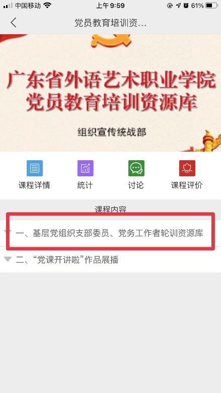 (三)点击页面底端“首页”,进入课程“党员教育培训资源库”。选择“基层党组织支部委员、党务工作者轮训资源库”中第二期的党课视频进行观看学习。