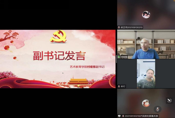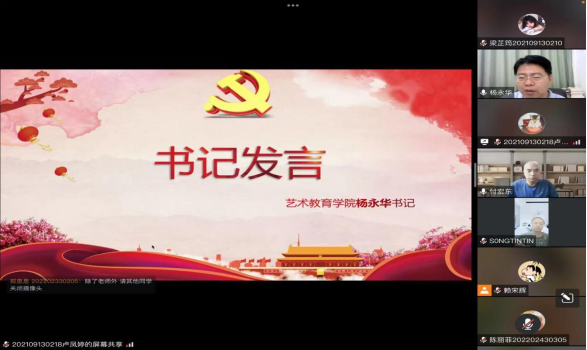 为切实做好新生入党启蒙教育工作,帮助新生更好地了解党的基本知识、端正入党动机、掌握入党要求、熟知入党程序,引导新生积极向党组织靠拢,艺术教育学院于10月28日在腾讯会议平台召开了新生入党启蒙教育大会。本次会议由学生党支部赖宋辉主持,艺术教育学院党委书记杨永华、党委副书记付宏东、学生党支部书记宋玎、党员教师杨柳絮、韩闻艺、学生党员以及全体新生参加了本次会议。