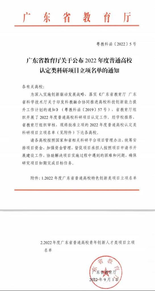 根据《广东省教育厅关于公布2022年度普通高校认定类科研项目立项名单的通知》(粤教科函〔2022〕5号),艺术教育学院徐磊、刘卫宇老师申报项目获得广东省教育厅2022年普通高校青年创新人才类项目立项。