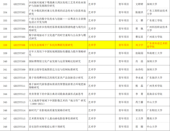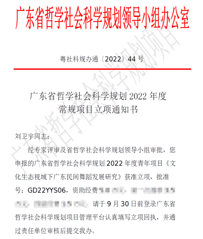 近日,广东省哲学社会科学规划领导小组办公室发布了《广东省社科规划2022年度常规项目立项名单》,艺术教育学院刘卫宇老师主持的《文化生态视域下广东民间舞蹈发展研究》喜获立项。据悉,此次立项中,艺术学项目共42项,高职院校仅1项,高职院校的艺术学立项率约2.4%。同时,青年项目共139项,高职院校仅2项,高职院校的青年项目立项率约1.4%。