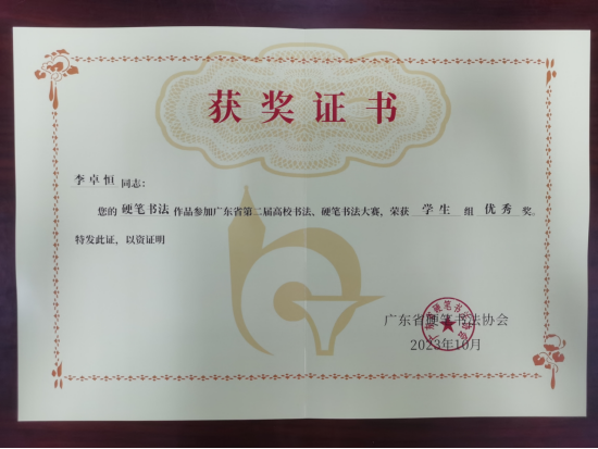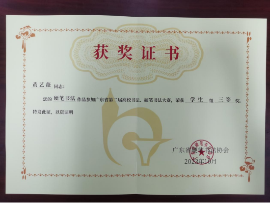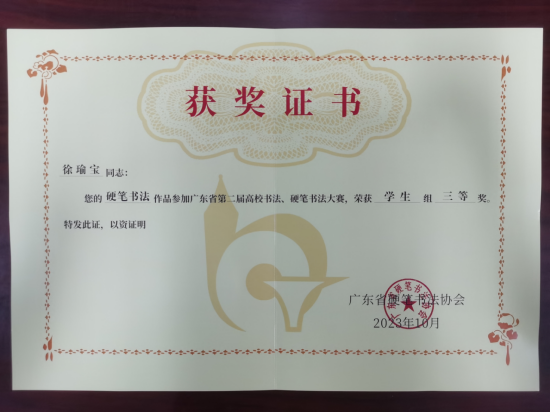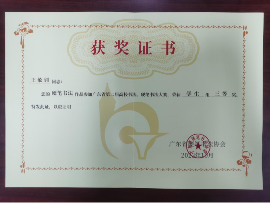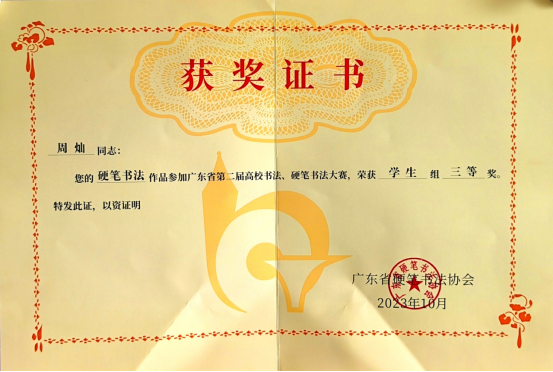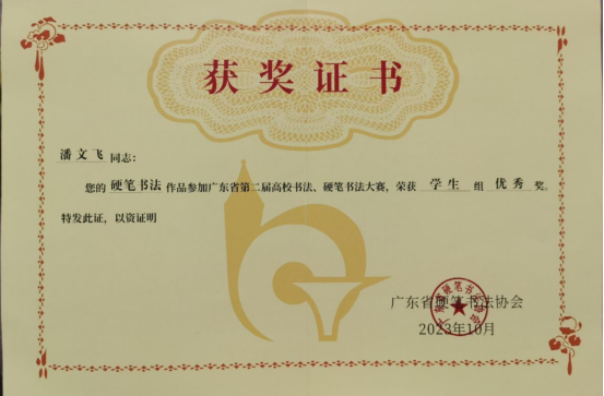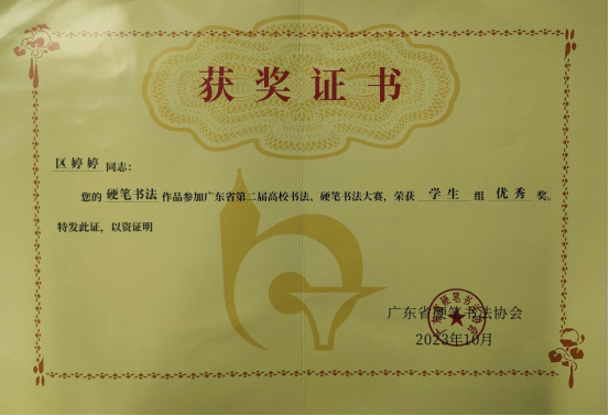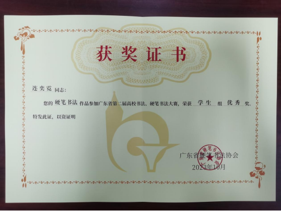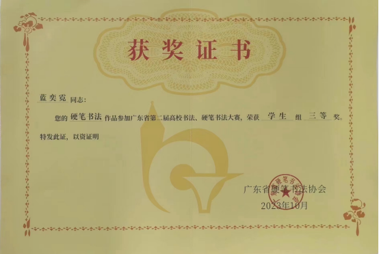 在学生竞赛方面,艺术教育学院的表现同样令人瞩目。徐瑜宝、黄艺薇、王敏钊、周灿、蓝奕霓五名同学在激烈的竞争中脱颖而出,分别获得学生硬笔组的三等奖。连奕霓、李卓恒、区婷婷、潘文飞四名学生也以其卓越的书法技艺荣获学生硬笔组的优秀奖。这些成绩的取得,不仅证明了同学们在书法的扎实基础,更是他们在师资的精心指导和自身不懈努力下的成果。