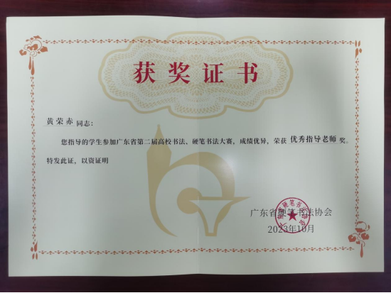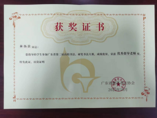 在教职工组硬笔组比赛中,林扬浪老师荣获三等奖及优秀指导教师。黄荣赤老师获得优秀指导教师的荣誉称号。反映了艺术教育学院在书法艺术教育方面的深厚底蕴。