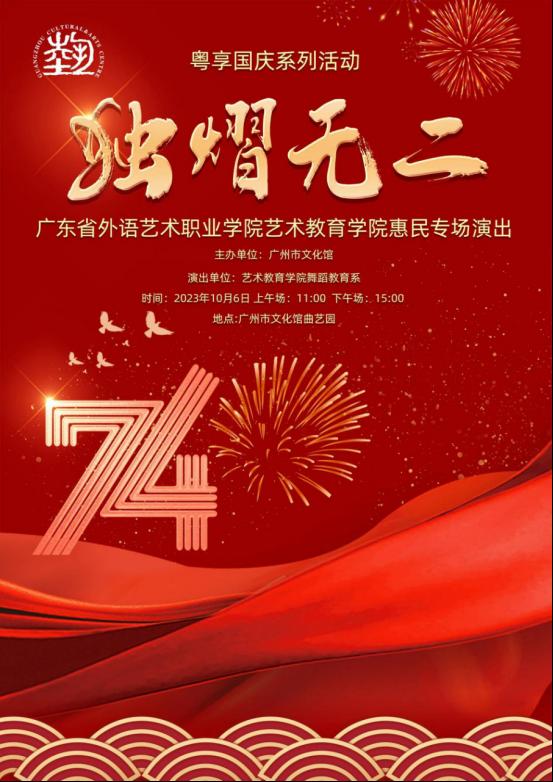 国庆假期,广州市文化馆主办举办了“粤享国庆”系列活动,内容包括非遗及艺术展览、文化惠民演出、沉浸式文化体验、公益艺术培训等内容。旨在推进广州市公共文化配送服务活动持续发力,打造广州市公共文化服务产品供给的“开放式中央厨房”,让广州的公共文化生活焕发出更绚丽的光彩。