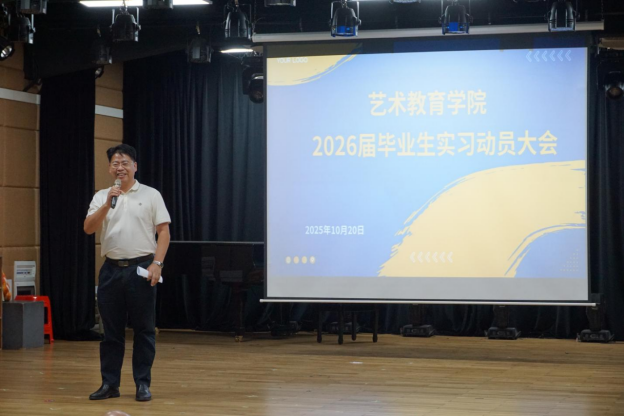 为引导学生明确实习目标、确保教育实习工作顺利开展,2025年10月20日,艺术教育学院于实训楼小音乐厅分场次隆重举行了2026届毕业生实习动员大会。学院党委杨永华书记、付宏东副书记、程争副院长及毕业班辅导员出席会议并作动员讲话,2026届音乐教育、美术教育、体育教育、艺术教育等专业全体毕业生参会。