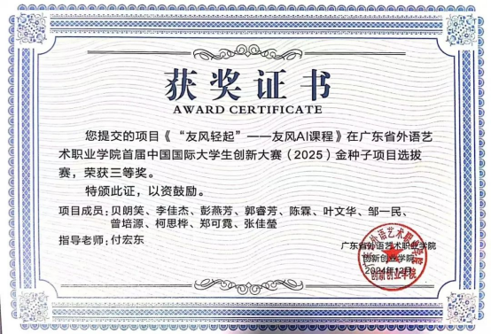 “ ‘友风轻起’——友风 AI 课程 ”项目也凭借独特的视角与创新的理念,荣获三等奖。指导老师有:付宏东;项目成员有:贝朗笑、李佳杰、彭燕芳、郭睿芳、陈霖、叶文华、邹一民、曾培源、柯思桦、郑可霓、张佳瑩。