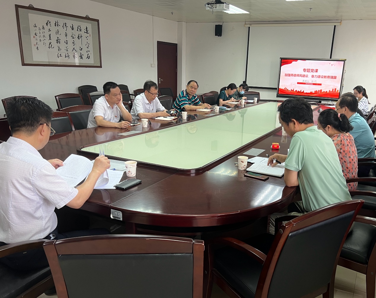 为深入开展学习贯彻习近平新时代中国特色社会主义思想主题教育,进一步加强师德师风建设,培养高质量教师队伍,弘扬尊师重教的社会风尚,6月28日下午,学校党委委员、副校长张侃到中职教育部海珠校区行政楼六楼会议室讲授“加强师德师风建设 奋力建设教育强国”专题党课。本次党课学习由中职教育部主任刘伟峰主持,中职教育部党政班子成员、科级以上干部参加了本次会议。