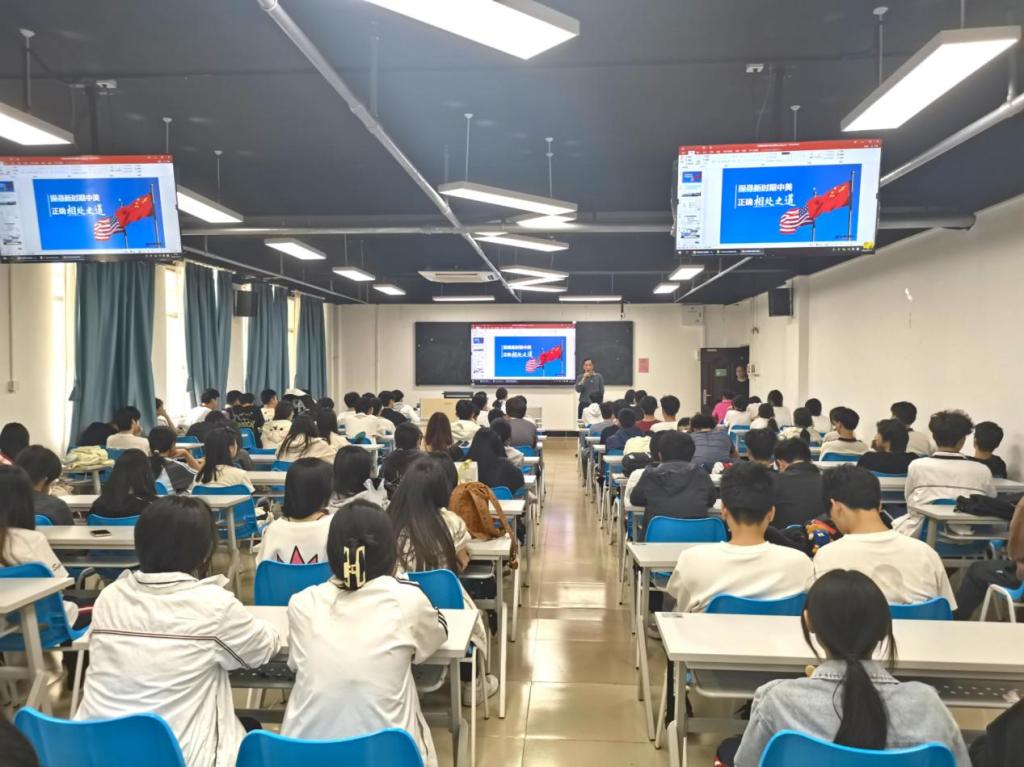 刘伟峰主任在304大教室以“探寻新时期中美正确相处之道”为主题,为23电商1班、23电商2班、23汽修班学生分析了当前中美关系的发展态势。刘伟峰主任表示,中美关系作为世界上最重要的双边关系之一,对我国乃至全球都具有重要意义。在新的历史时期,我们要理性看待中美关系,努力寻求合作共赢,推动两国关系健康稳定发展。