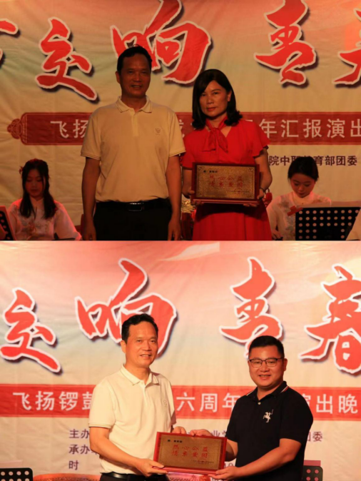 本次汇报演出由社团指导老师蔡俊华主持。中职教育部刘主任致辞,并向支持锣鼓队建设的热心人士黄丽华、黄家俊、许燕雪颁发荣誉牌匾。