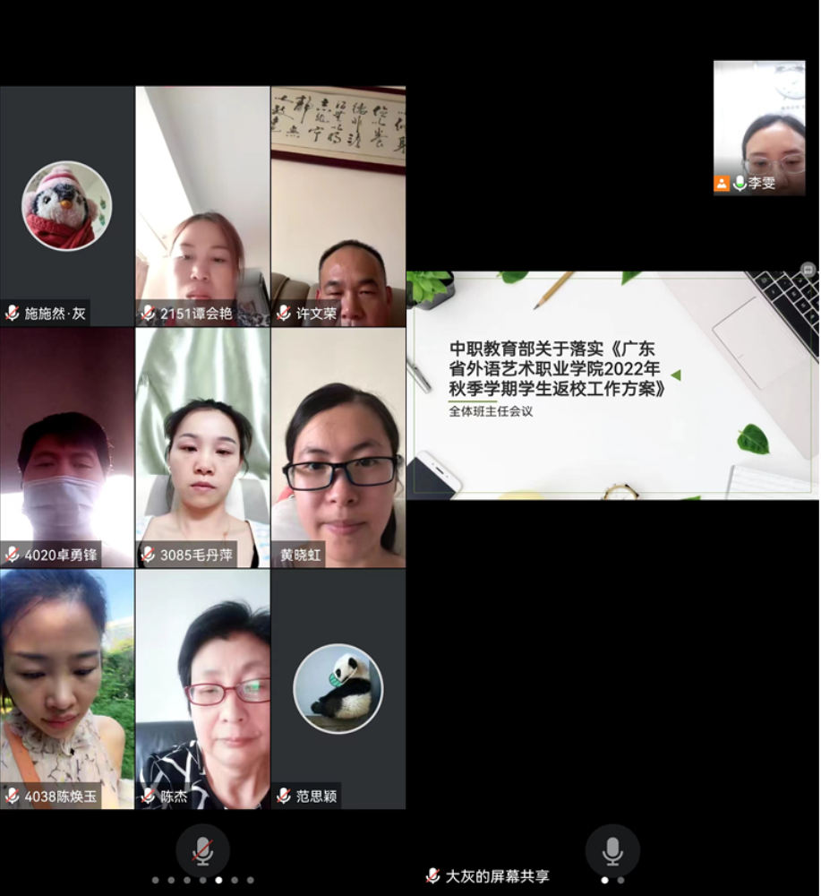 为贯彻落实《金鼎娱乐最新官方网址2022年秋季学期学生返校工作方案》,切实做好常态化疫情防控和秋季学期学生返校教育管理服务工作,8月22日下午,中职教育部通过线上会议举行班主任会议。会议由中职教育部党总支副书记李雯主持,海珠校区、龙洞校区、天平架校区、花都校区中职班主任参加。